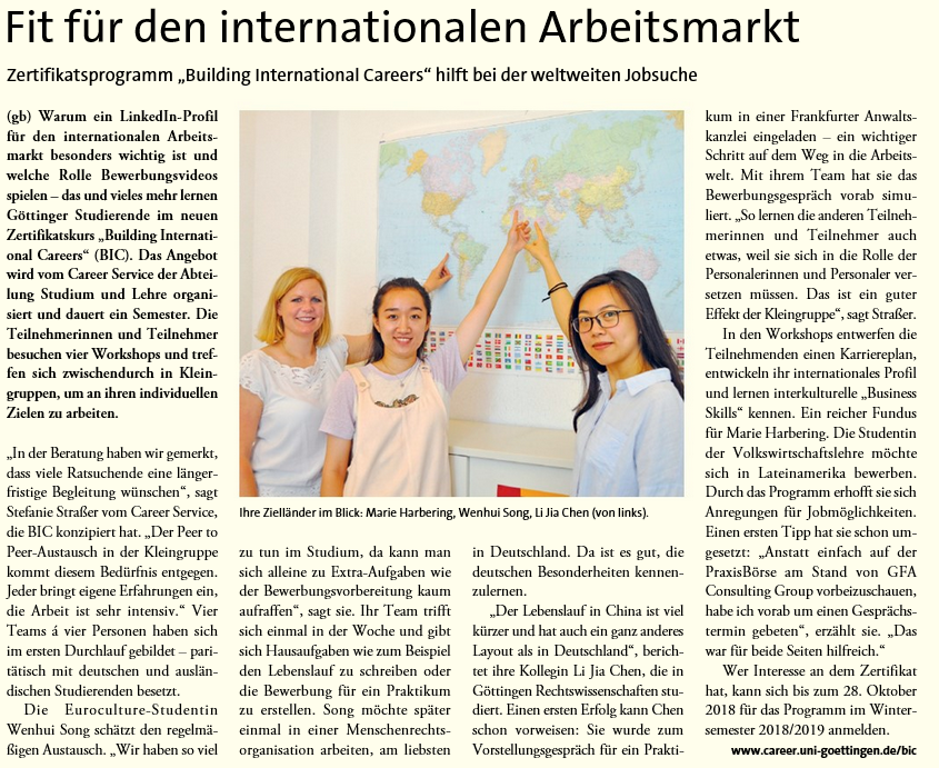 In order to professionally prepare German and international students for the requirements of the global job market during their Bachelor's or Master's studies, the Career Service of the University of Göttingen designed a support service across all faculties with the project "International Career Counseling".As part of the project, which was financed by central study quality funds, the Career Service provided special support to German and international students in their orientation, job search, and application for international activities from April 2015 to March 2022.